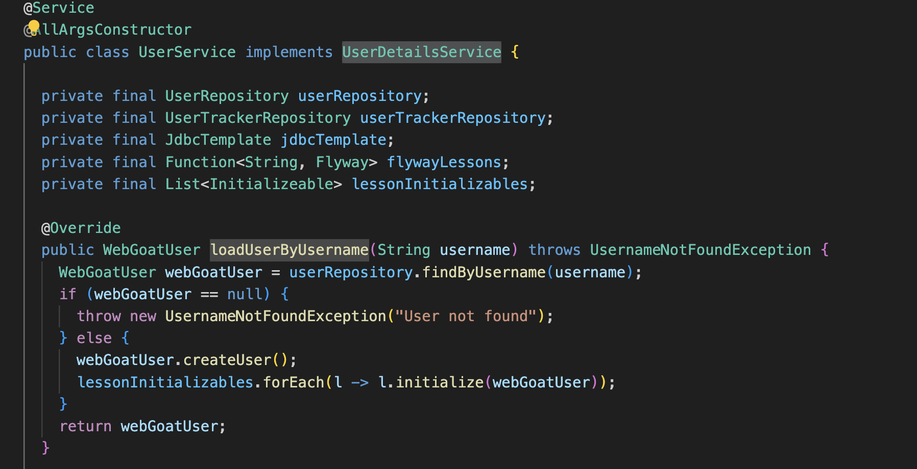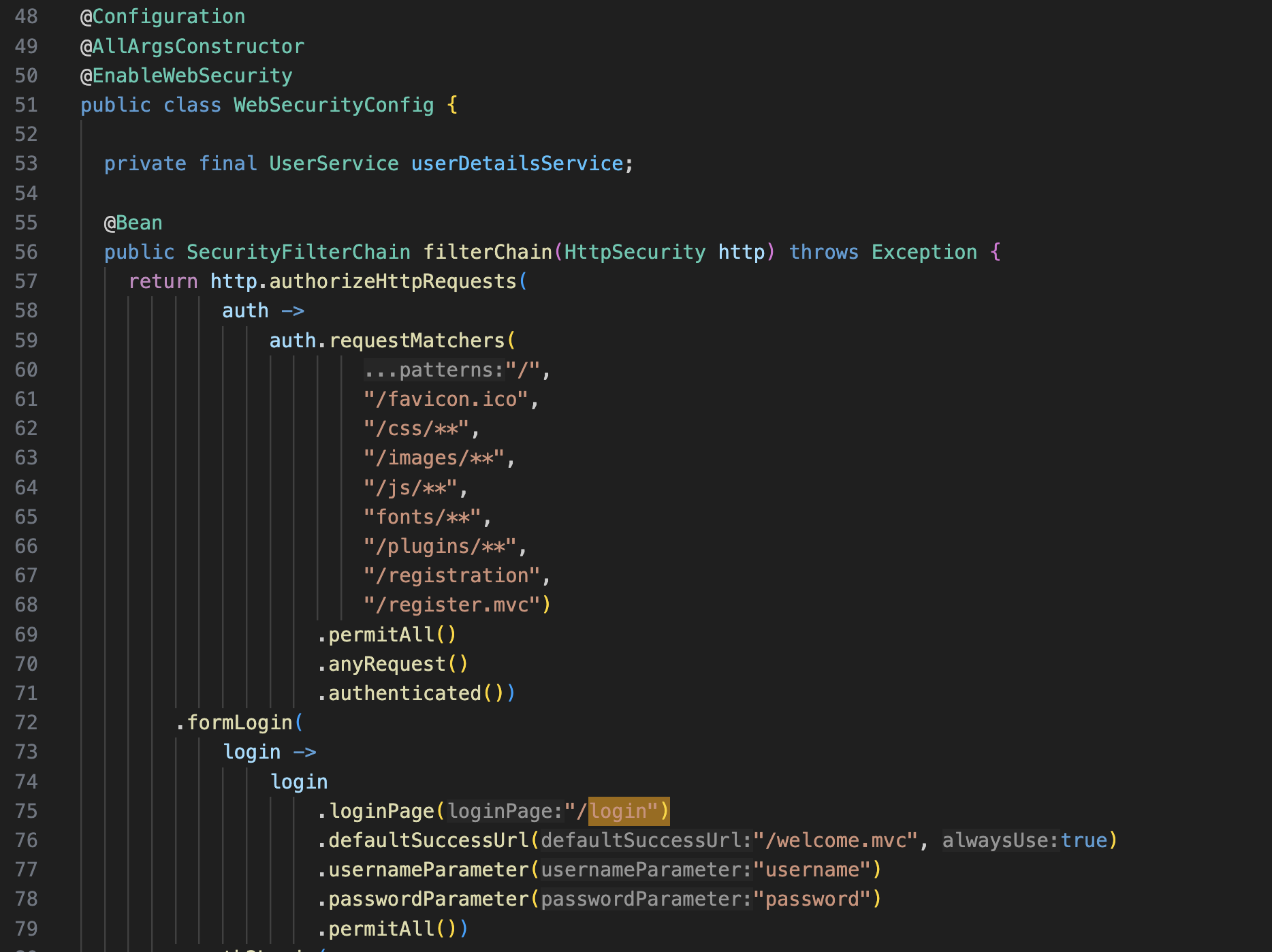 Login 페이지에 대한 URL을 확인해보니, "/WebGoat/login" 이였습니다. 소스코드에 가서 /WebGoat/login 을 검색해보니 특별히 검색되는 코드가 존재하지 않습니다. "/WebGoat"는 Controller에서 공통으로 지정해 두었을 수도 있기 때문에 이번에는 "/login"으로 검색해 보았습니다, 검색되는 파일이 꽤 존재하는데 이 중에 Login을 처리하는 서비스 로직(ex. loginProcessingUrl)이 검색되지 않았지만, Spring Security 를 통해 로그인을 구성하고 있는 것이 확인되었습니다