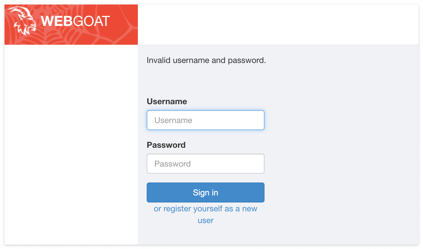 WebGoat docker image를 실행하고 서비스에 접속하면 가장 먼저 로그인 기능을 확인할 수 있습니다.