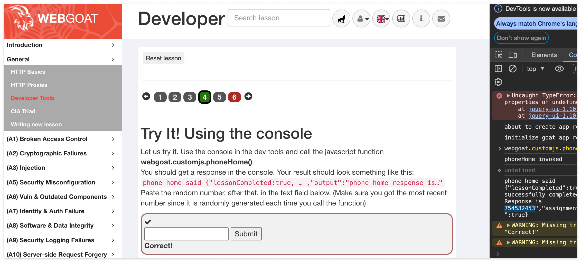 그럼 다시 퀴즈를 진행해보자. 구글 개발자 툴에서 Console 탭으로 이동 후 webgoat.customjs.phoneHome() 스크립트 함수를 실행해보면, 콘솔 로그를 통해 생성된 랜덤값을 확인할 수 있다.