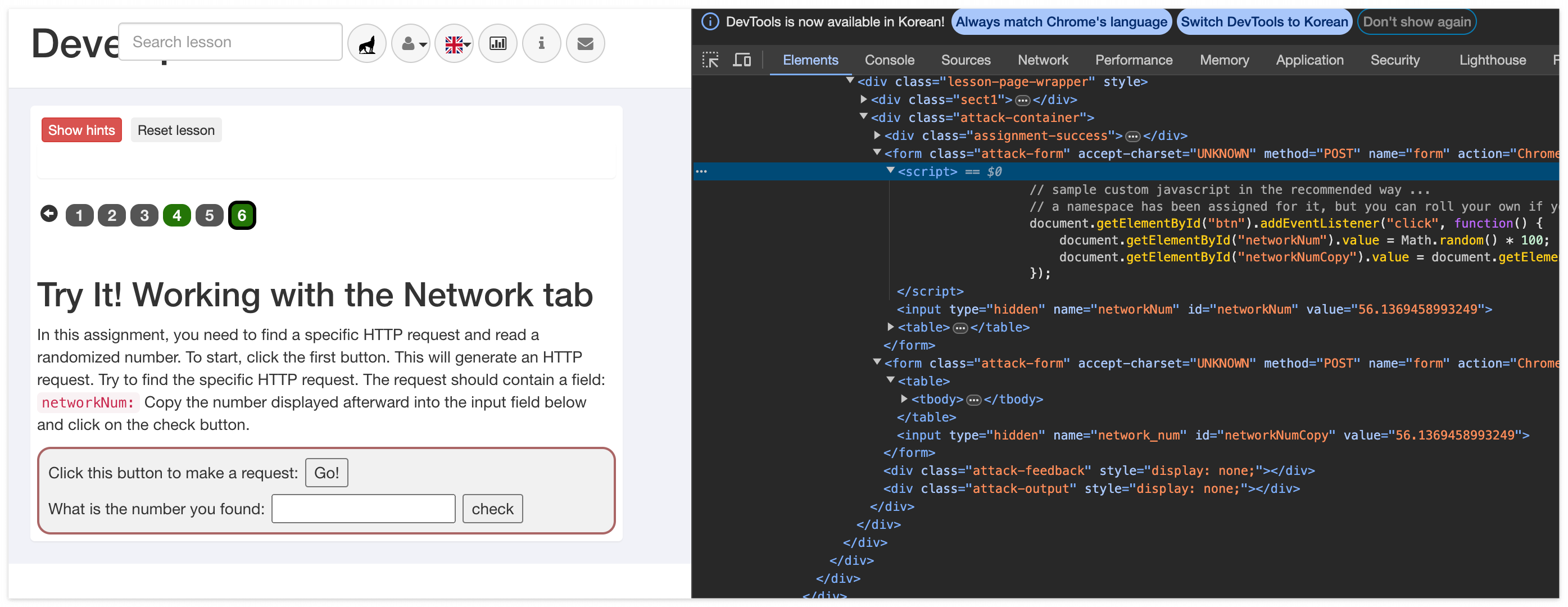 이를 보면, 해당 퀴즈는 굳이 네트워크 패킷을 확인하지 않고, Go 버튼을 클릭 후 networkNum의 값을 Element 기능을 통해 확인할 수 있다.