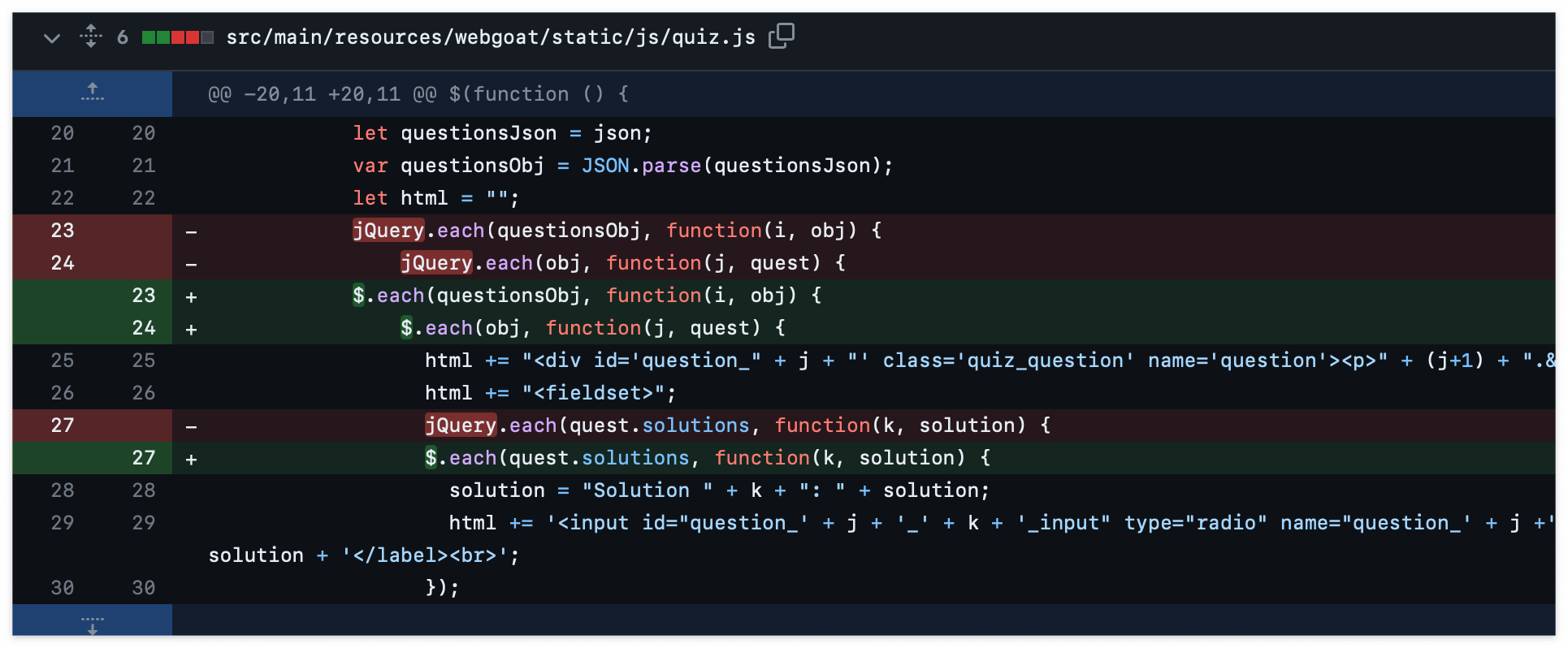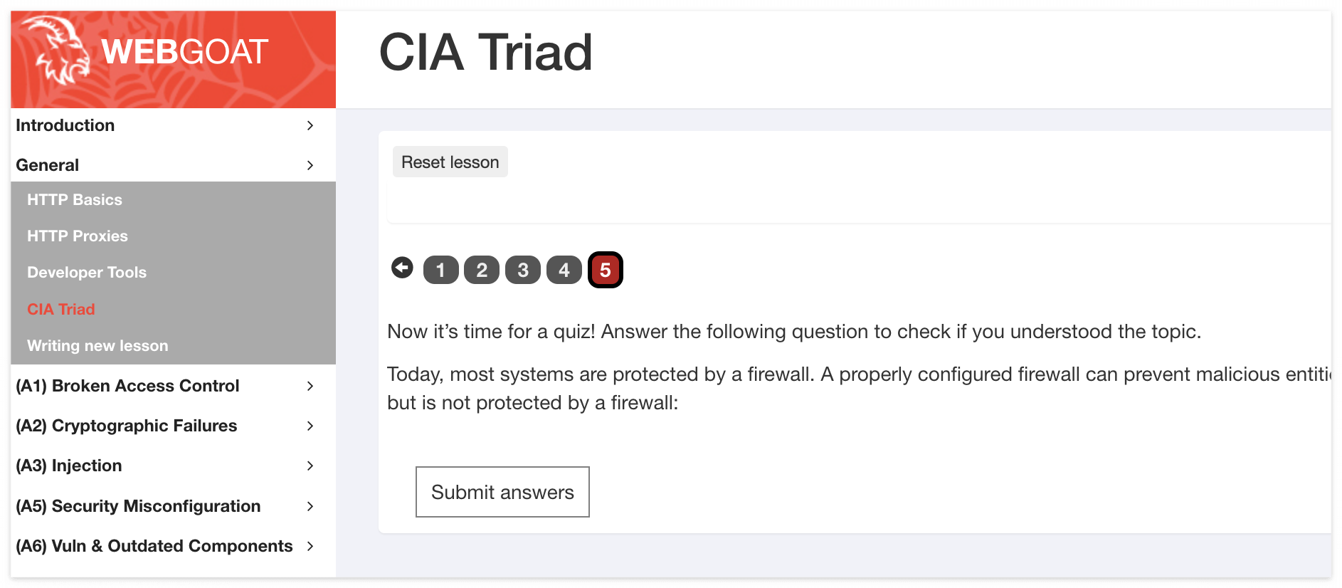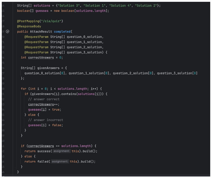 현재 WebGoat에는 이러한 타입의 퀴즈가 5개 밖에 없는 것 같아서, 크게 문제가 되지는 않을 것 같다.