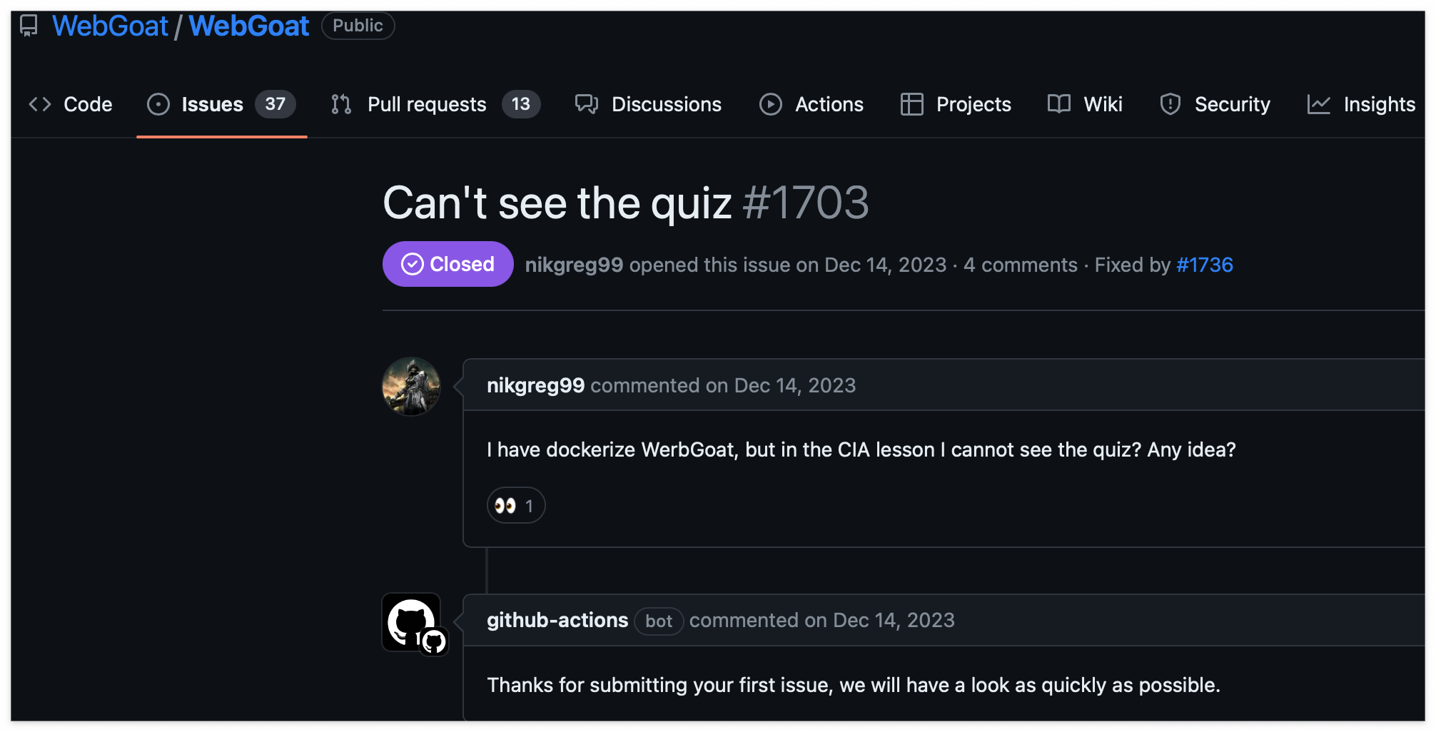 그래서 우선 해당 이슈에 대해서 검색을 해보았다. OWASP WebGoat Git에 가보니 나와 같은 이슈가 레포트 되어 있었고, 최근에 해당 이슈가 해결되어 코드도 머지된 것으로 보인다.