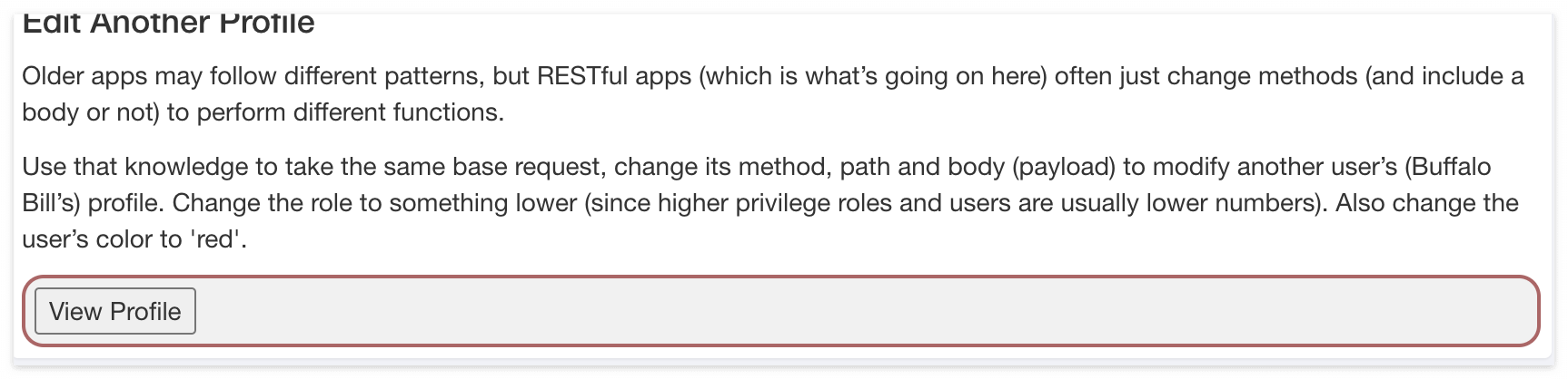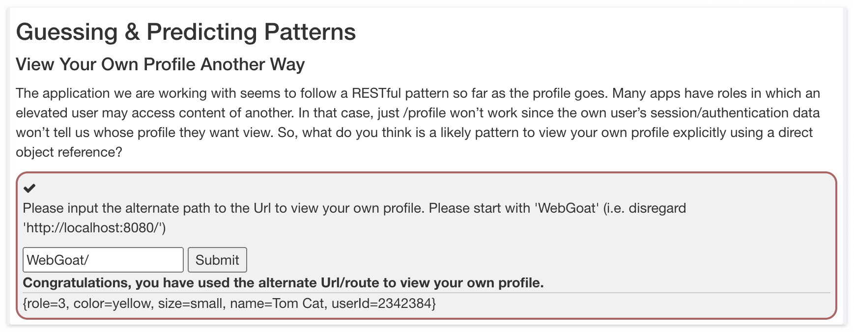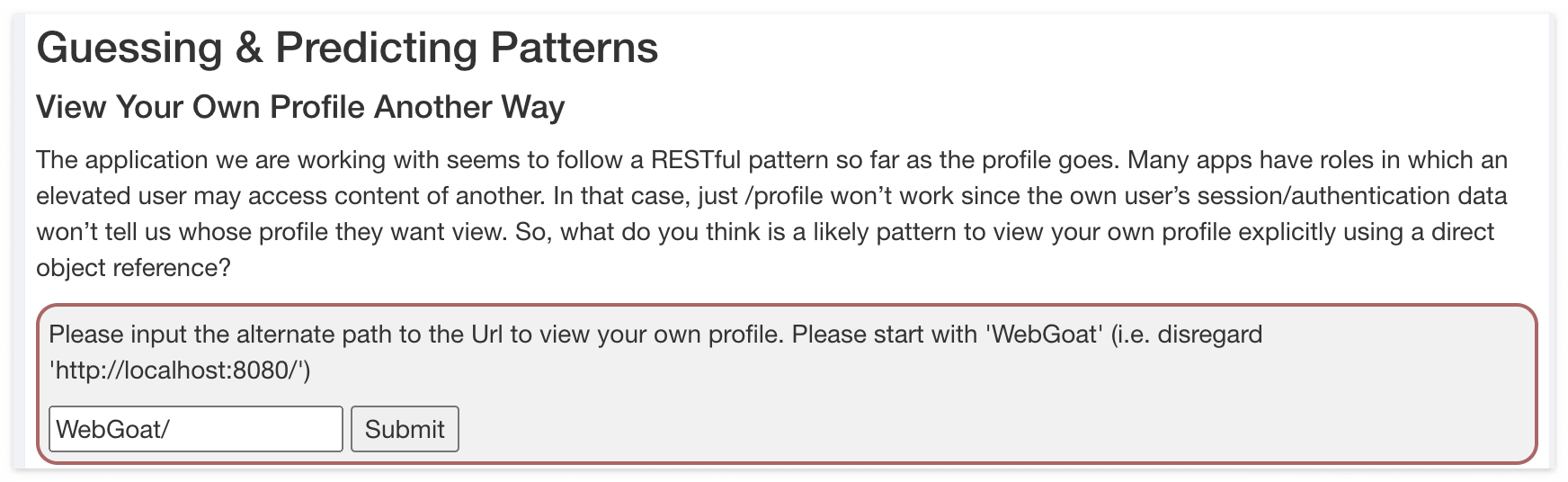 우선 퀴즈 내용은 Profile 보는 부분이 RESTful API로 되어 있고, 누구의 Profile 정보를 조회하려고 하는 것인지 알려주기 위해서 내부적으로 어떤 Path가 사용되어야 하는 것인지를 물어보는 것 같다. 예측 컨데, Profile을 제공하는 별도 리소스 서버가 있고, 본 WebGoat는 Front-end 서비스라고 가정한 것으로 보인다. 그리고 WebGoat가 별도의 리소스 서버에 유저 Profile 정보를 조회하기 위해 유저 식별자를 전달해야 한다는 것을 이야기 하고 싶은 것 같다.