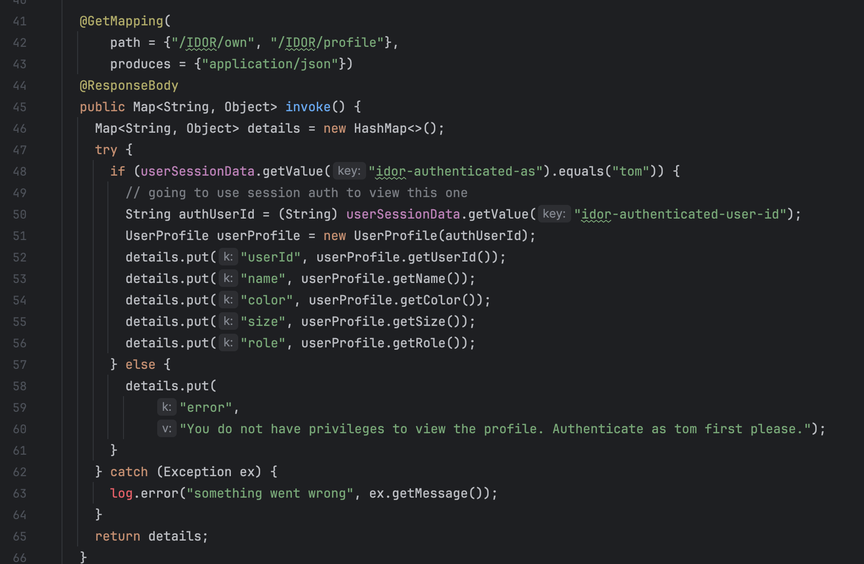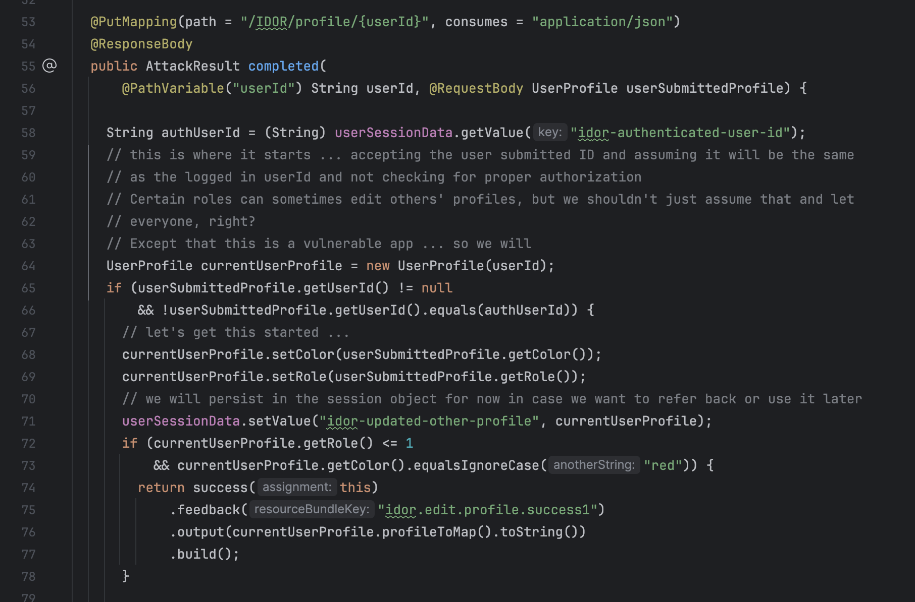 일반적으로 Profile은 본인의 정보만 조회 및 수정이 가능해야 한다. 이를 위해 요청자가 접근하려는 정보 객체에 대한 권한이 있는지 검증해야 한다. 이 코드를 자세히 보면, 세션 데이터를 사용하여 수정하려는 객체의 소유자 정보를 검증하려고 한다. 그런데 조건절을 보면, Body로 전달한 객체내 userId와 세션 내 저장된 userId가 다른 경우에 Exception 처리하지 않고, 데이터를 업데이트 해주고 있다. Profile 정보를 업데이트 할 때에는 반드시 요청자가 접근하려는 객체에 대한 권한이 있는지 올바르게 검증되어야 한다.