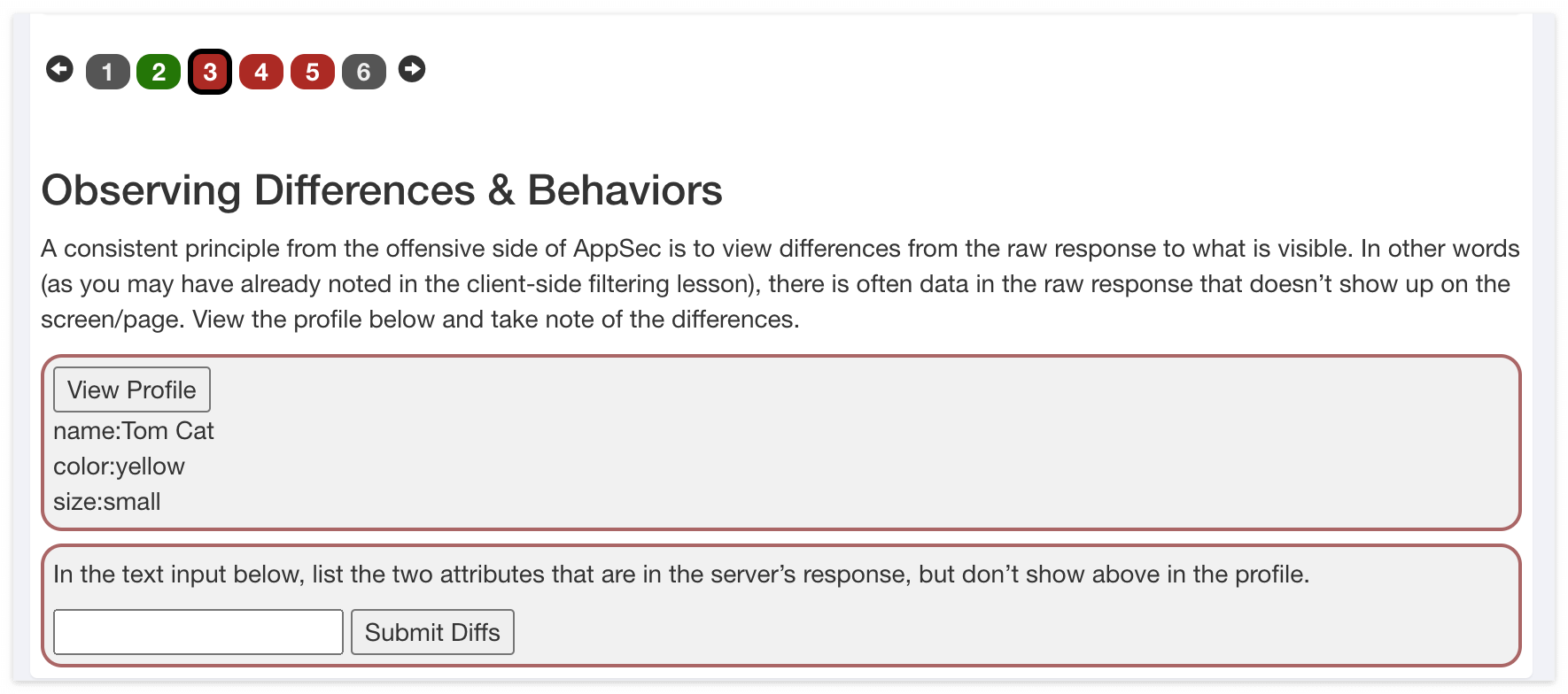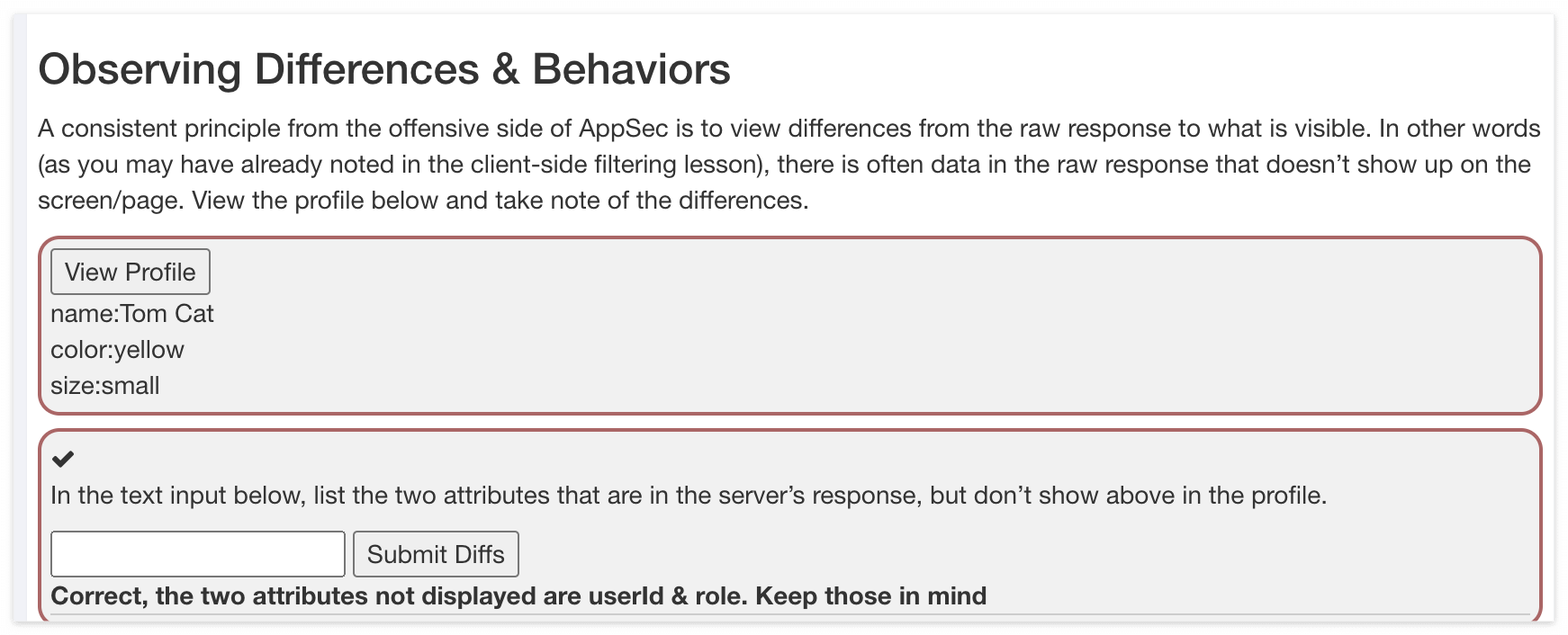 퀴즈에서는 Profile에서 보여지지 않는 2개의 Attributes를 제출하라고 되어 있으니, role과 userId를 작성하에 제출해보면 첫 번째 퀴즈에 통과한 것을 알 수 있다.