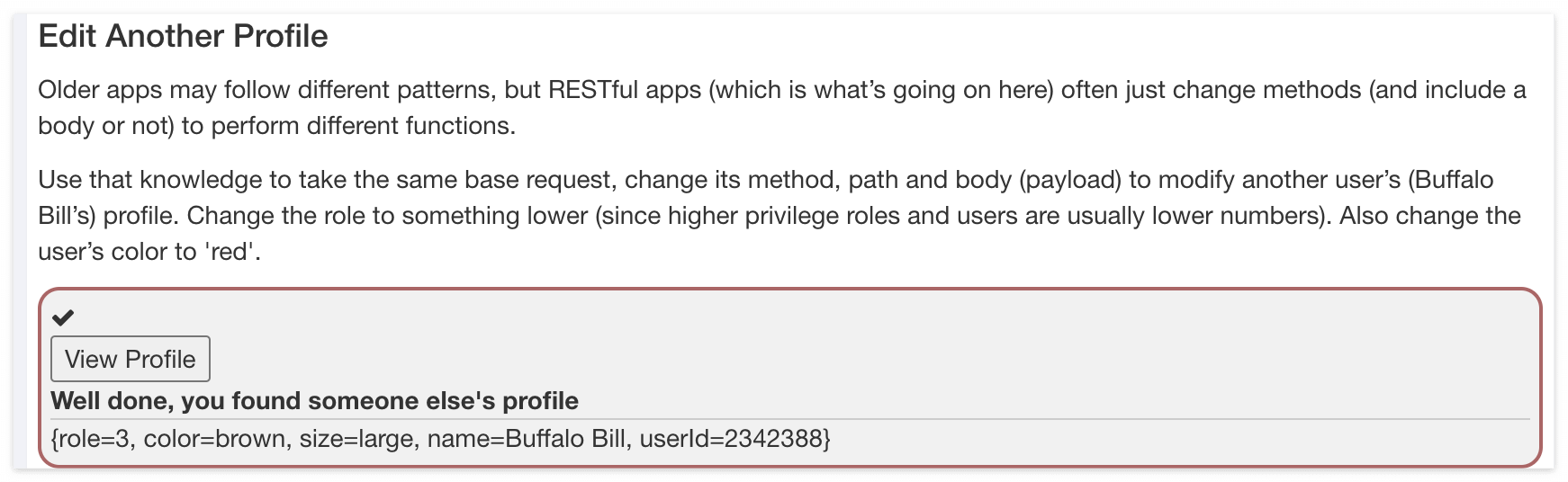 이 Path를 이야기 하는 것이고, 일반적인 RESTful API에서 데이터 조회방식을 사용한다고 가정해보면, /WebGoat/IDOR/profile/{userId} 를 전달해야 하는 것으로 보인다.
